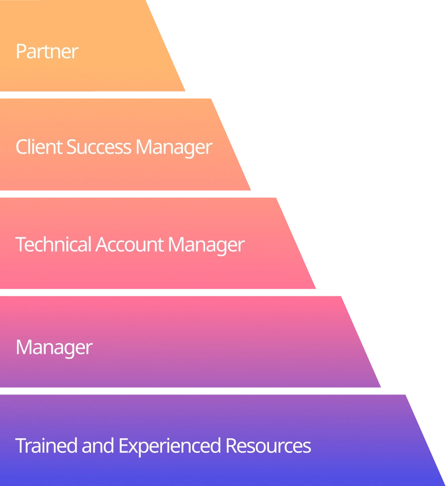 Leading the team is your Partner, who provides strategic oversight and ensures your goals are met, supported by the Client Success Manager, your primary point of contact for smooth communication. The Technical Account Manager handles all processes and technical aspects, backed by a Manager who oversees daily operations, while our Trained and Experienced Resources execute core tasks efficiently.